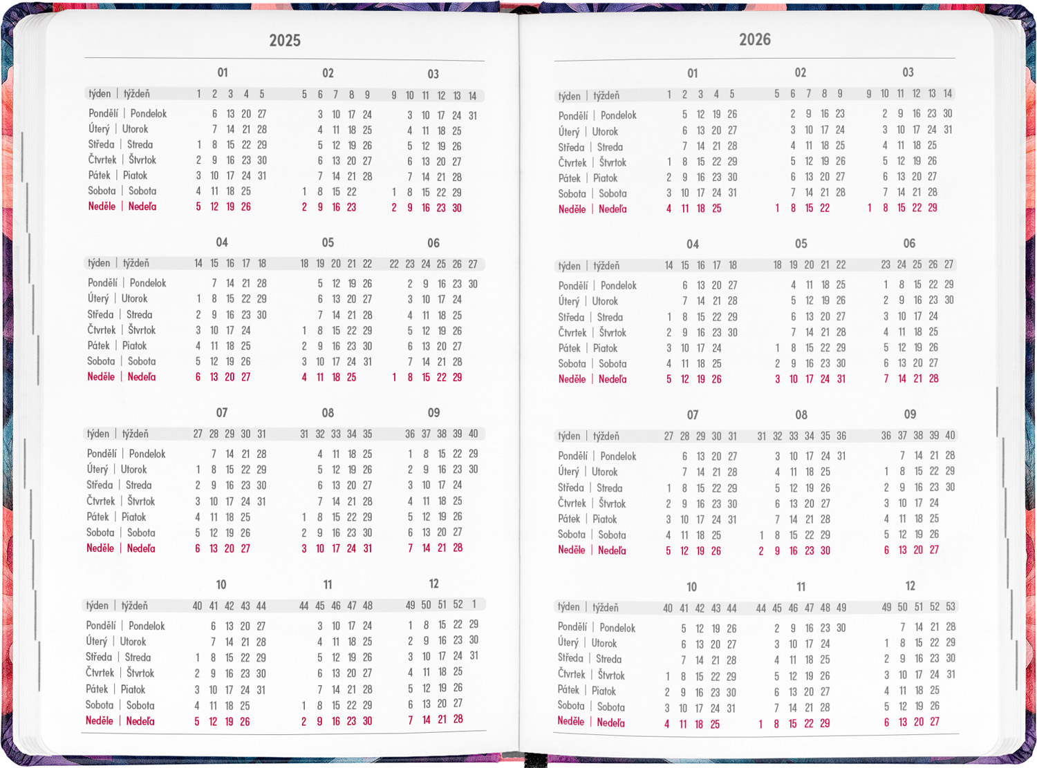Elegantní a praktický diář s pevnými deskami s květinovým motivem. Osmnáctiměsíční diář obsahuje přehled na rok 2025 a 2026, seznam českých a slovenských jmen, česko-slovenské týdenní řádkové kalendárium se jmény a svátky a prostor na poznámky. Kalendárium začíná v červenci 2025 a končí v prosinci 2026. Gramáž: 80 g/m². Počet 192 stran. Formát 110 x 170 mm.