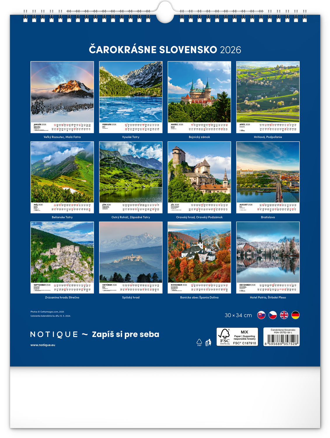*P26 PGN-35752-SK-L NOTIQUE Nástenný kalendár Čarokrásne Slovensko 2026, 30 x 34 cm
