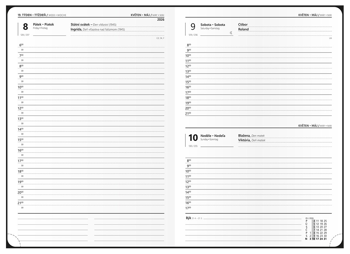 Originální diář A5 má ohebnou vazbu a obal imituje kůži. Díky výseku na tužku ve hřbetu diáře už nikdy nezapomenete na propisku, a tak se diář stane skvělým parťákem pro Vaše plánování. Flexovazba, jemný hladký materiál s lesklým povrchem, kulaté rohy, perforované rožky, kapitálky, 1x stužka, 1x ražba, mapa ČR a SR, vlepená kapsa, výsek na tužku, ofset, 70g/m2. Formát A5 (148 x 210 mm).