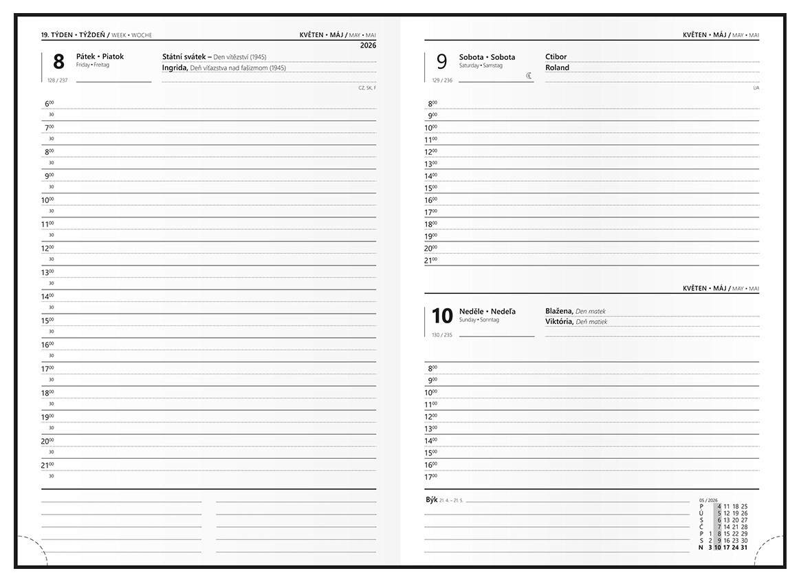 Denní diář z jemně strukturovaného materiálu s poutkem je vyráběný ve formátu A5 s prostorem pro plánování a poznámky. Ražba roku, jednostranná pěnová výplň desek, šitá vazba V8, stužka, perforované rožky, mapa ČR a SR, vlepená kapsa, poutko v barvě, ofset, 70g/m2. Formát A5 (148 x 210 mm).