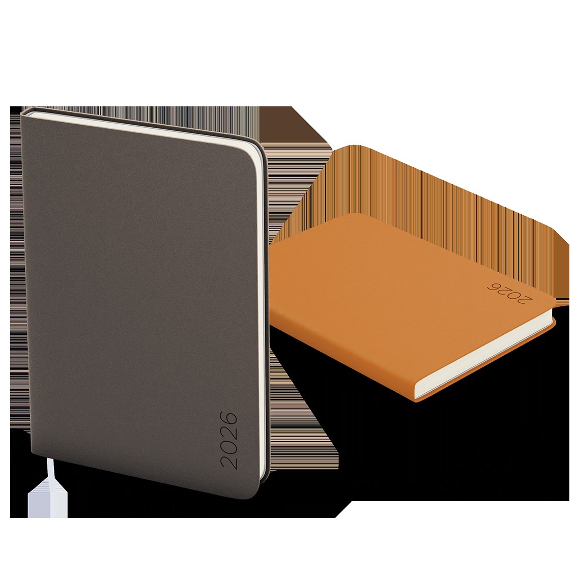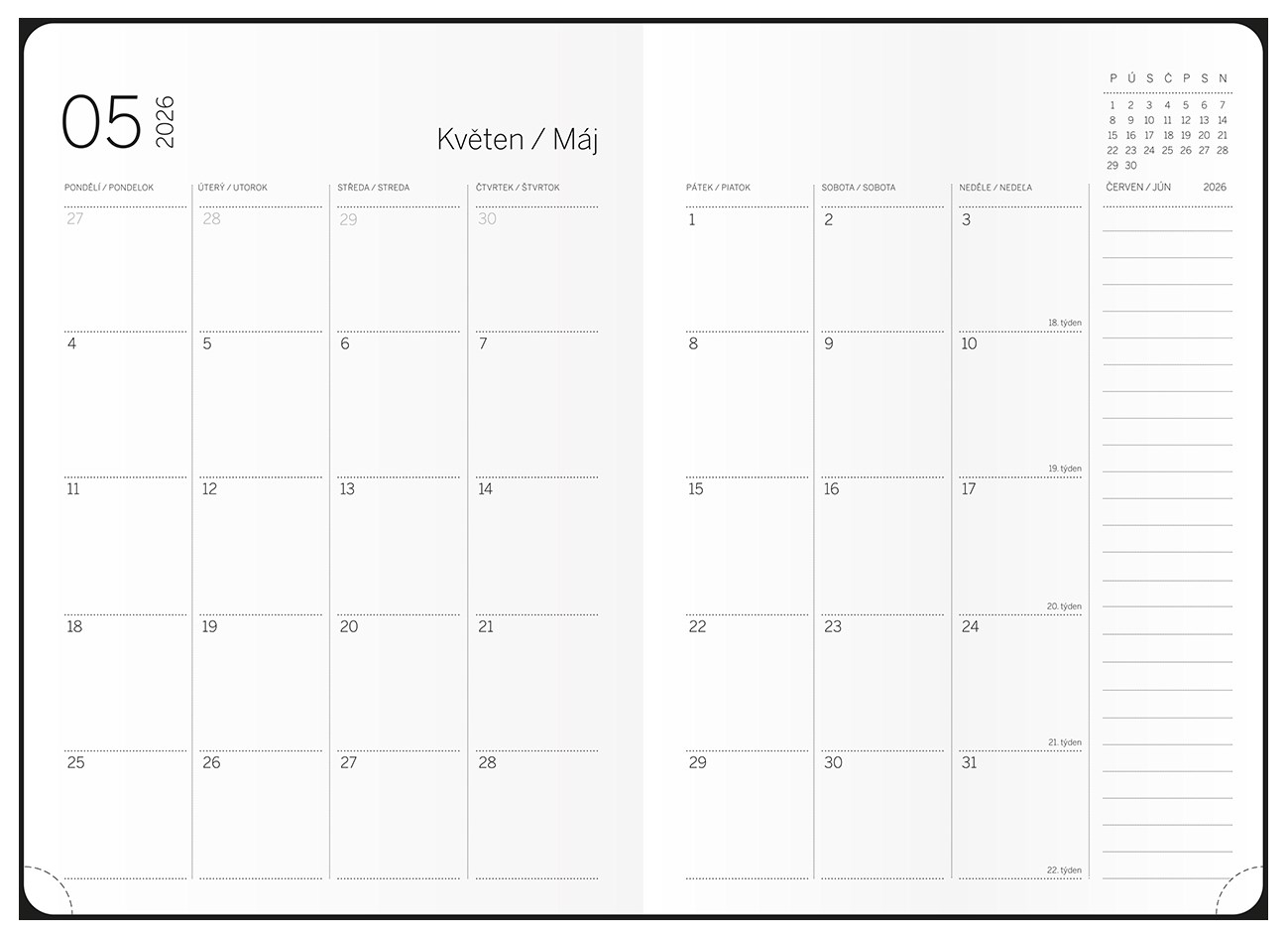 Unikátní měsíční diář s poznámkovým notesem. Na předních stranách tohoto managerského diáře můžete využít přehledné měsíční kalendárium a na zbývajících stranách na Vás čeká linkovaný i prázdný blok na Vaše poznámky. V8, měkké desky, potah NUBA, jemný materiál - imitace semiše, rovný hřbet, kulaté rohy bez kapitálku, 2x saténová stužka, 1x ražba roku, 128 str., ofset, 70g, 1/1, 32 str.: ofset 70g, 0/0 (60 linky, 20 prázdné, 80 měsíce + poznámky). Formát 160 x 230 mm.