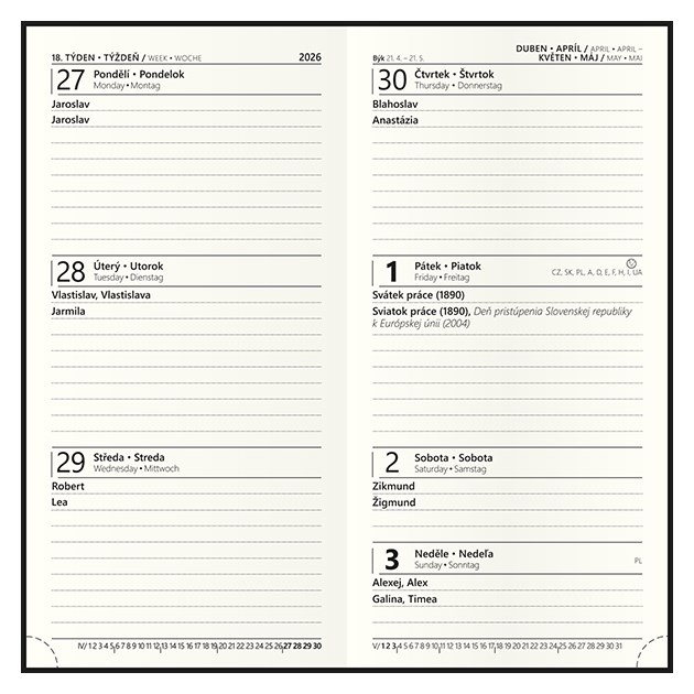 Týdenní kapesní diář vyrobený z hnědé koženky s moderní zlatou ražbou roku. Diář, který povýší jakoukoli Vaši schůzku. Jemný hladký materiál s lesklým povrchem, ražba roku, obšití v béžové barvě, šitá vazba V8, stužka, perforované rožky, ofset, 70g/m2, krémový papír. Formát 75 x 150 mm.