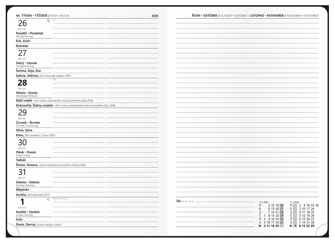 Diář s týdenním kalendáriem na jedné straně a na druhé straně s prostorem na poznámky. Desky jsou vyrobeny z oblíbeného materiálu Vivella s jednostrannou pěnovou výplní a s kulatými rohy. Jemný hladký materiál, ražba roku, jednostranná pěnová výplň desek, šitá vazba V8, stužka, kapitálky, perforované rožky, mapa ČR a SR, vlepená kapsa, kulaté rohy, ofset, 70g/m2, bílý papír, kulaté rožky. Formát A5 (148 x 210 mm).