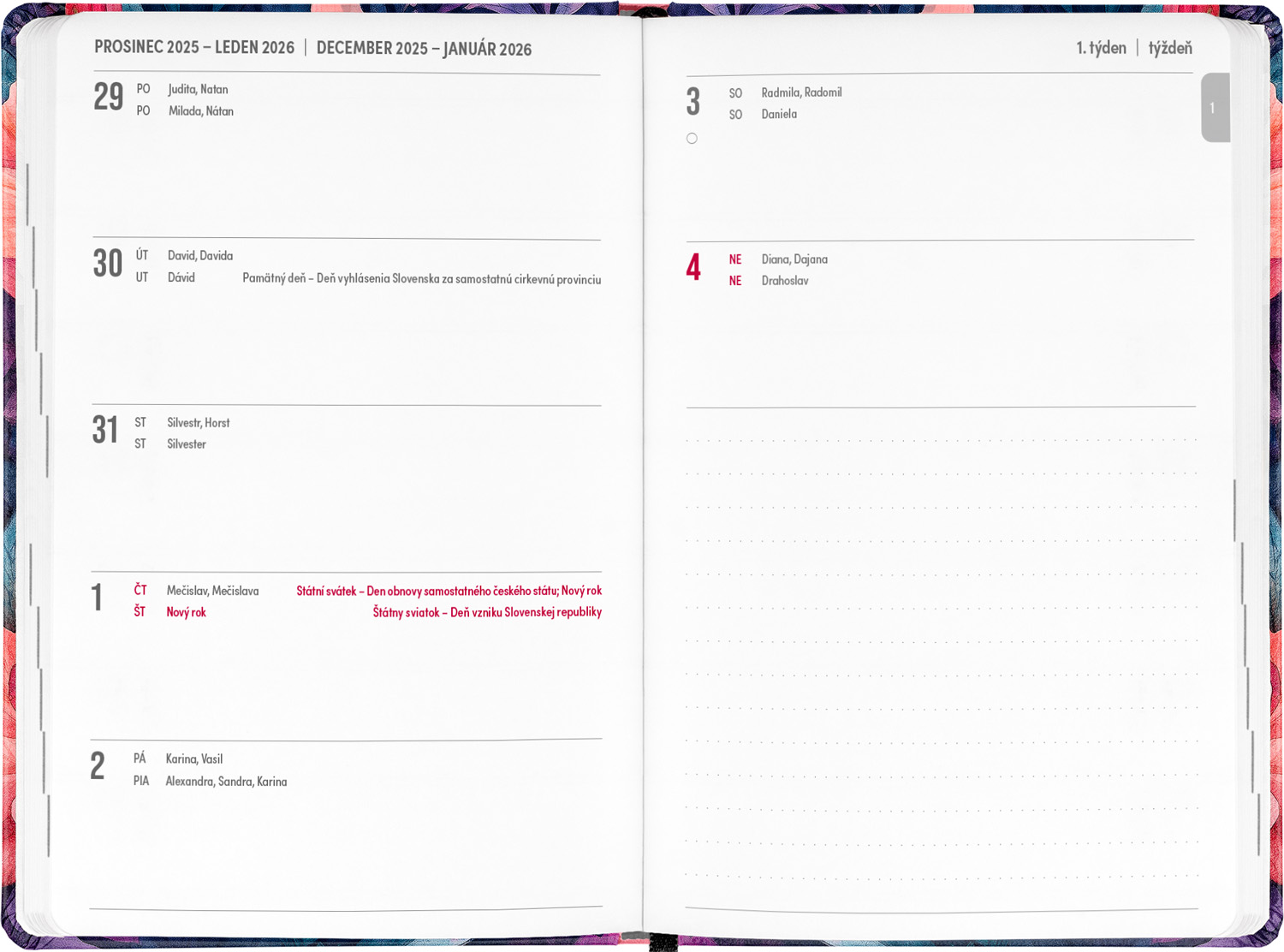 Elegantní a praktický diář s pevnými deskami s květinovým motivem. Osmnáctiměsíční diář obsahuje přehled na rok 2025 a 2026, seznam českých a slovenských jmen, česko-slovenské týdenní řádkové kalendárium se jmény a svátky a prostor na poznámky. Kalendárium začíná v červenci 2025 a končí v prosinci 2026. Gramáž: 80 g/m². Počet 192 stran. Formát 110 x 170 mm.