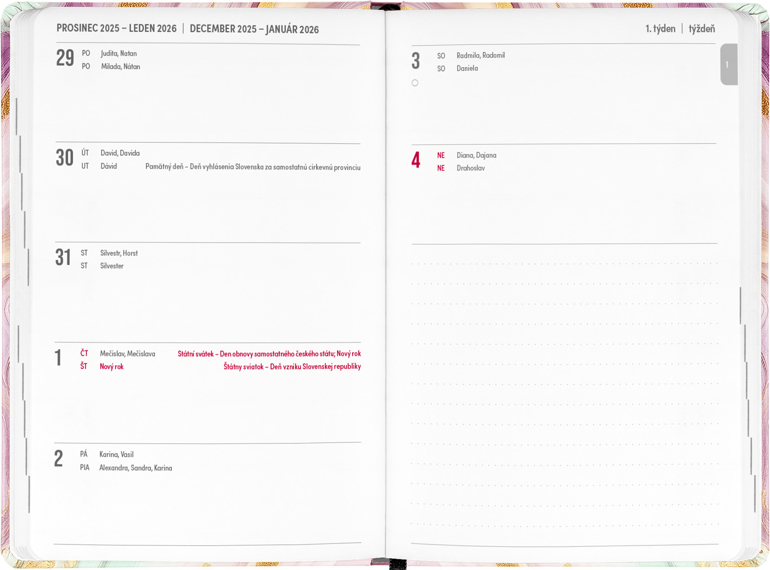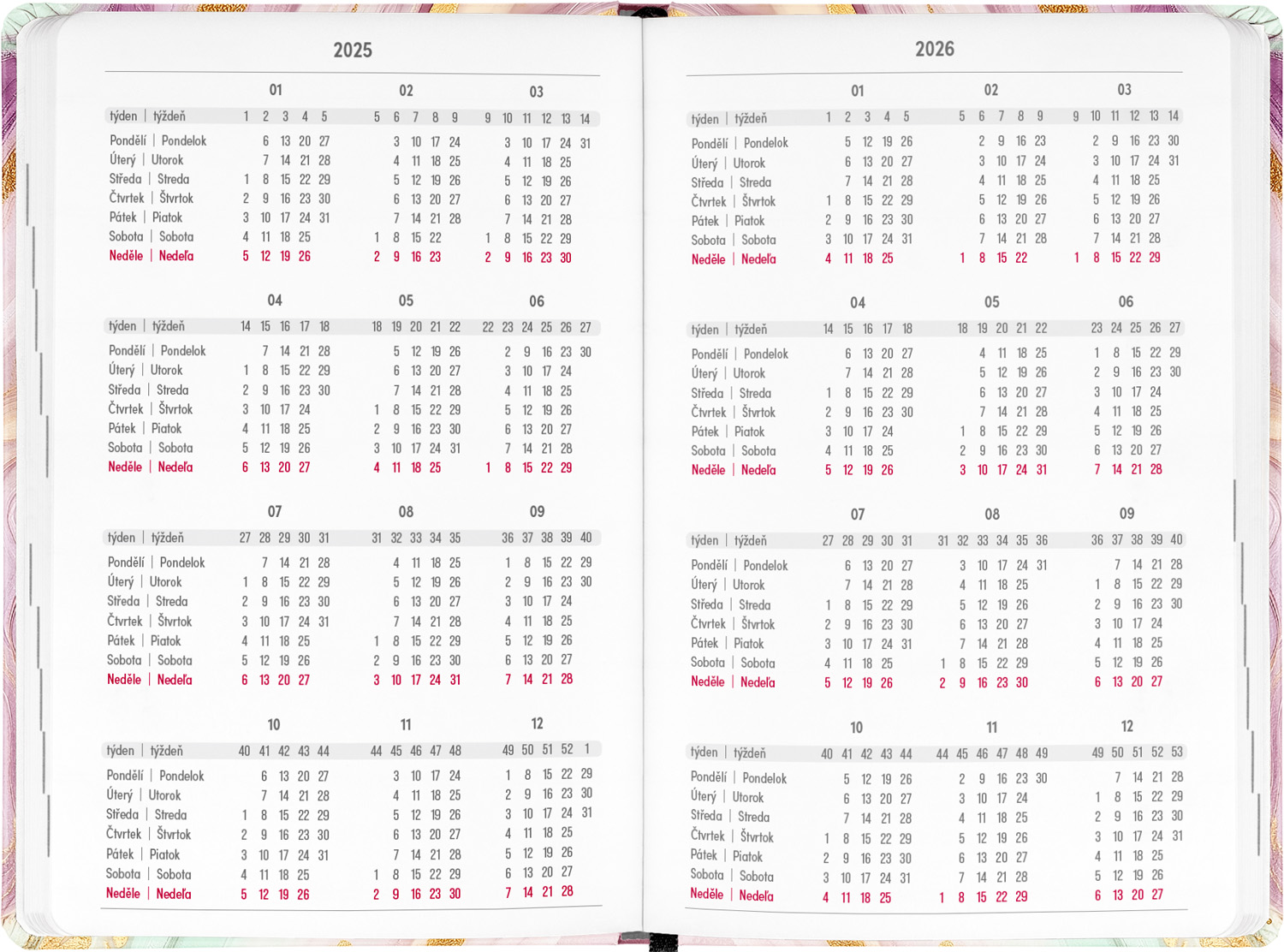 Elegantní a praktický diář s pevnými deskami s motivem růžového mramoru. Osmnáctiměsíční diář obsahuje přehled na rok 2025 a 2026, seznam českých a slovenských jmen, česko-slovenské týdenní řádkové kalendárium se jmény a svátky a prostor na poznámky. Kalendárium začíná v červenci 2025 a končí v prosinci 2026. Gramáž: 80 g/m². Počet 192 stran. Formát 110 x 170 mm.