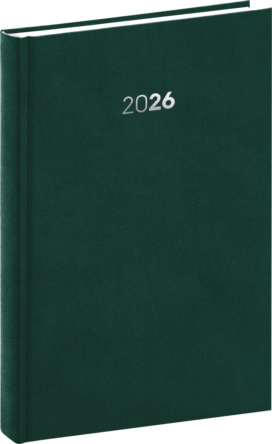Plánovací denní diář Balakon 2026 v zeleném provedení, doplněný o stříbrný letopočet. Povrch diáře si získal oblibu díky kvalitnímu svrchnímu materiálu, který je extrémně odolný vůči vnějšímu poškození. Denní rozvrh s česko-slovenským kalendáriem a doplňkovou angličtinou, němčinou, maďarštinou a ruštinou. Gramáž 70 g/m². Počet 352 stran. Formát: 15 x 21 cm.